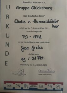 Am 12. Mai 2024 hat Elodie mit mir erneut die IFC-IFH 2 bestanden und diesmal mit 91 Punkten. Das bedeutet es ist ein „sehr gut“ und damit eine Qualifikation für die Teilnahme an der Landesausscheidungsprüfung. Allerdings wird die Zeit knapp im Sommer noch die 2. erforderliche Qualifikation zu schaffen…